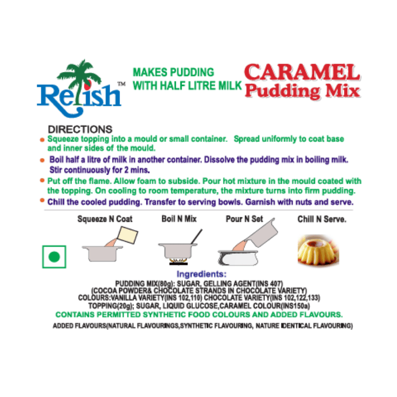 Pudding Mix (80g): Sugar, permitted stabilisers, gelling agents, flavours, food colours (Vanilla INS 102, Chocolate INS 102, 122, 133).