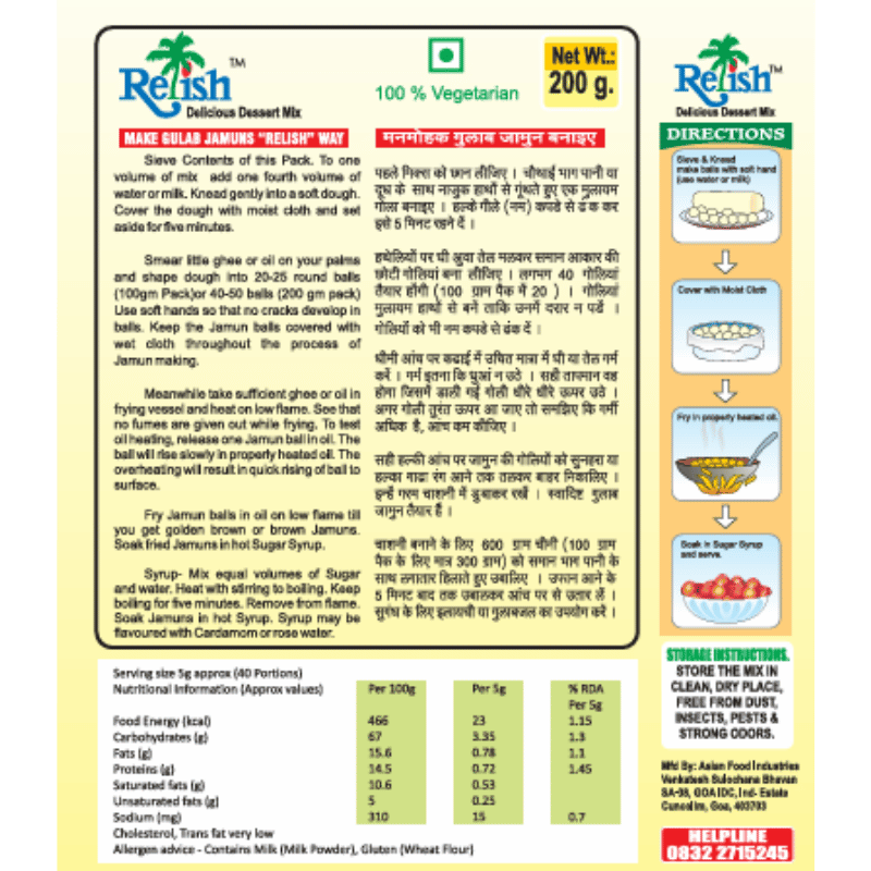 Try relish gulab jamun mix a savory delight that melts in your mouth! Comes in a pack of 200gms. Relish gulab jamun is trans fats free. Available in 200 gms box packs, 500 gms poly packs, and 1 kg poly packs.